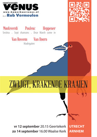 Een a capella-programma met vooral 20e-eeuwse muziek, gecombineerd met Monteverdi’s Sestina. Uniek voor ons waren de madrigalen van Andries van Rossem en Frans van Doorn in het Nederlands, een taal waarin we eigenlijk nooit zingen.